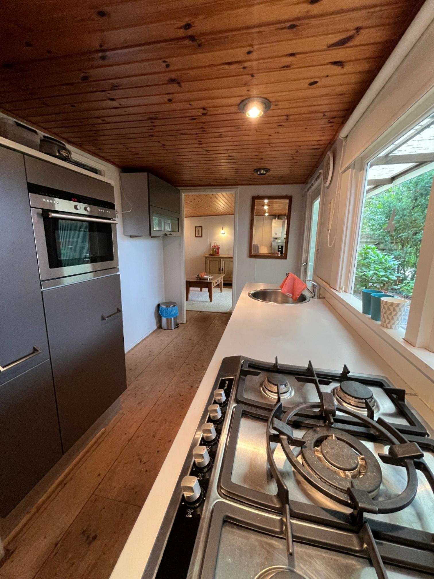 De woonkamer is fijn ruim en heeft een grote glazen pui zodat u buiten ook binnnen kunt ervaren. Ook de keuken heeft een fijne afmeting en heeft veel kastruimte. U vindt er daarnaast een Siemens magnetron, een Siemens vaatwasser, een koelkast en een vijfpits gasstel. Zowel de twee slaapkamers als de badkamer zijn compact, maar bieden toch al hetgeen u nodig heeft voor een fijn verblijf. Aan de rechterkant van de bungalow is de inpandige schuur.