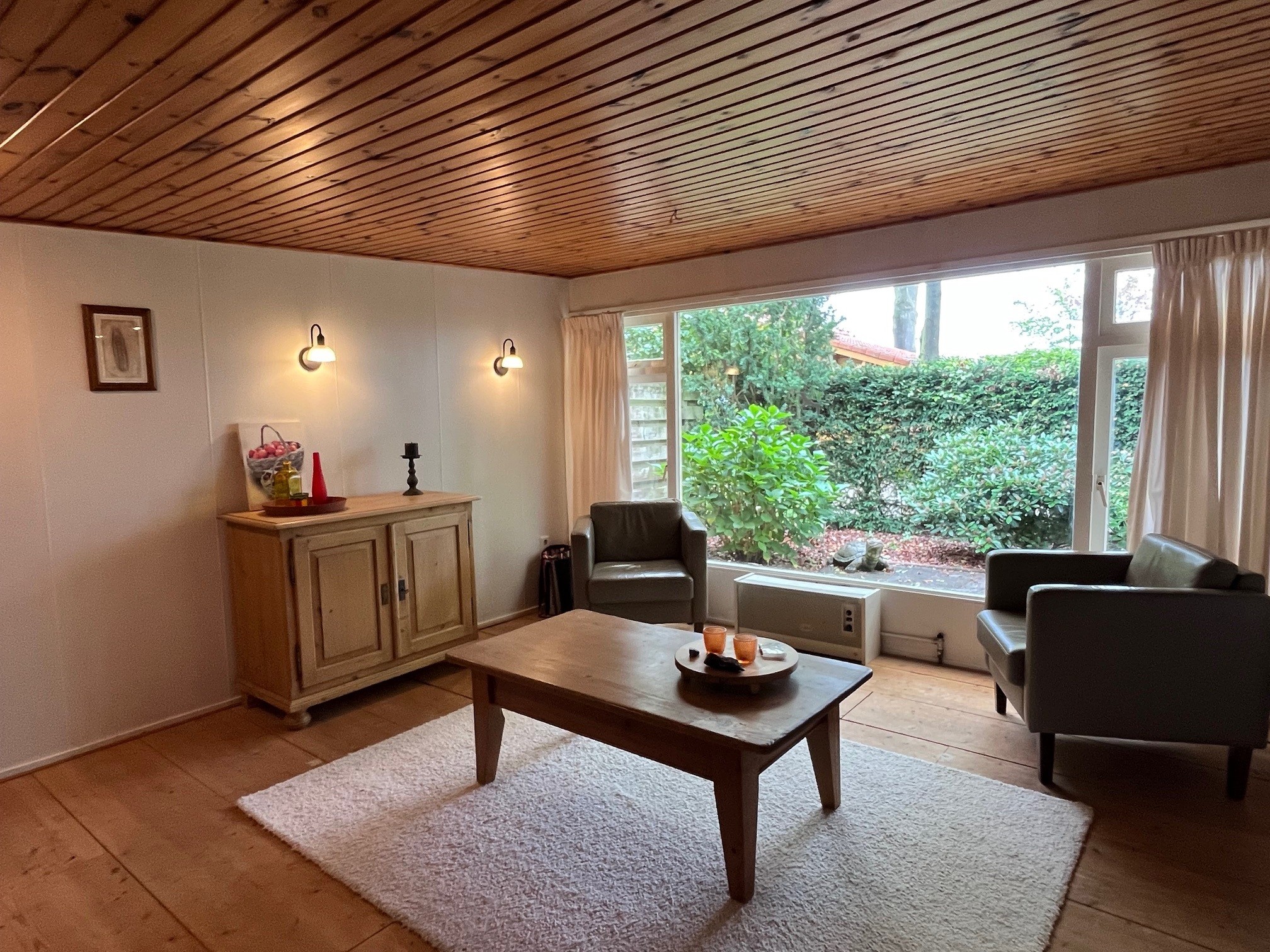 Door de hele bungalow liggen oude kaasplanken op de vloer in de kleur grenen.  De wanden zijn afgewerkt met decorplaten 'wit-hout'. Voor de verwarming is er een gevelkachel onder het grote raam in de woonkamer, voor de warmwatervoorziening is er een keukengeiser (nog met open systeem).